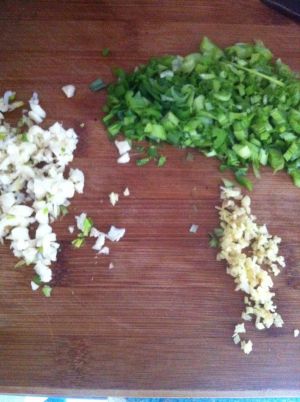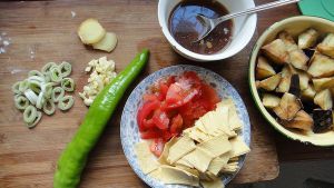 把高汤或水、蚝油1匙、醋1匙,糖、鸡精若干,生抽1匙 ,兑成汁;准备葱姜蒜、青椒、西红柿,我还另加了点油皮儿。有的做法是要炒五花肉丁的,我还是算了吧,这就够长肉的啦,五花肉就不用了。纯素。