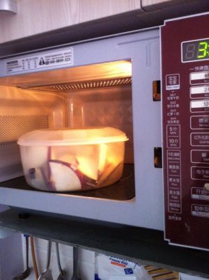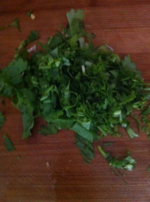 放微波好去水的茄子片烧制,放盐,糖,生抽,面酱,香油,香菜碎,祘碎即可。