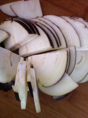 先将茄子切成大点的厚片,或是粗条。面粉加五香粉和盐和成稠糊,放入茄子,裹上面糊。用油炸至金黄色。(一次少放几块。一块一块炸)最后再全放进锅里炸一下。