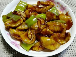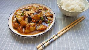 热油先爆香葱姜蒜末 (喜欢辣的可以加些郫县豆瓣),随后倒入茄子,放入切好的蕃茄(可不要蕃茄),略炒后倒入由酱油,香醋,盐,糖水,淀粉,鸡粉 调成的汁。上浆后关火,放入青椒块翻匀后点缀少许蒜末。