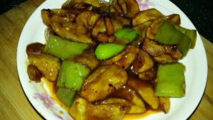 另起锅,倒入少许油,加大蒜爆锅,加入茄块、青辣椒翻炒,倒少许酱油,水淀粉,鸡精,翻炒片刻加入白糖。