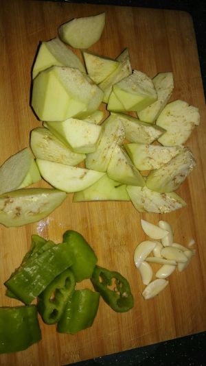 茄子,土豆,尖椒分别切滚刀块,葱蒜切末