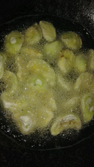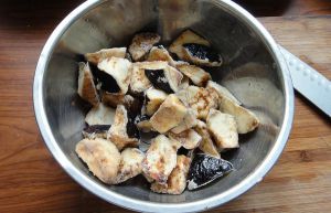 锅中放入花生油,油热后下茄子块,炸到微黄色捞出!