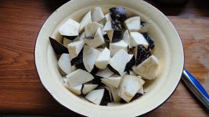 茄子切滚刀块,先用盐杀出水份来,腌一会儿。