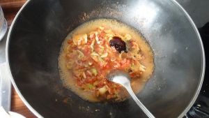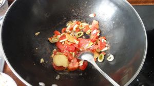 锅中留少于余油,不要太多,要不会很腻,放入葱蒜吵香,加入西红柿尖椒块