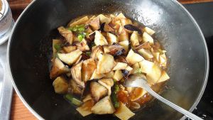 差不多了,下豆皮儿,略煮,倒入茄子块和青椒丁,翻拌均匀即可。