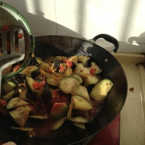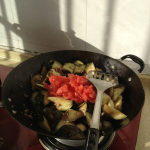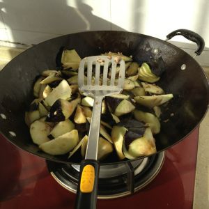 油热后下茄子翻炒,茄子变软变色后捞出备用