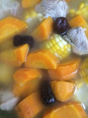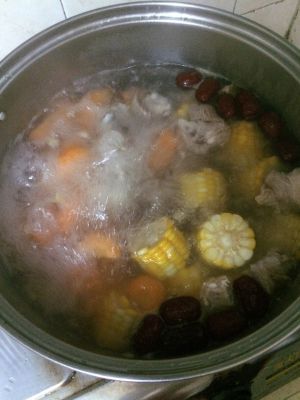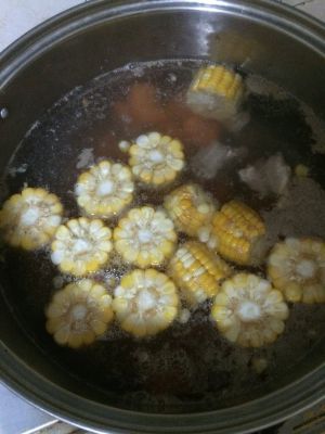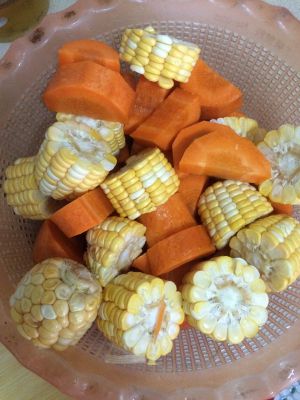 滴几滴醋,加入玉米胡萝卜,继续烧开,转小火煮1小时左右,出锅前放盐即可。