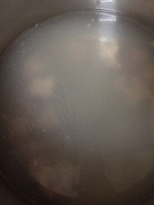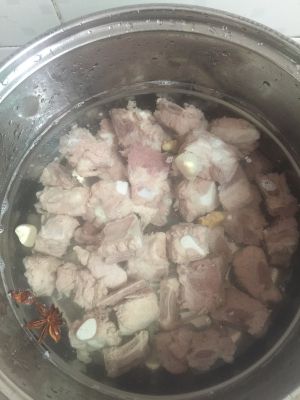 清洗排骨:我喜欢刚买回家先不洗,直接过水,然后再一块块清洗。洗好后这次没炒直接放水、大蒜、姜片、八角、红枣开始炖。