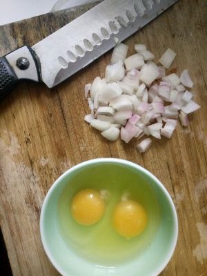 把洋葱切丁,鸡蛋打在碗里