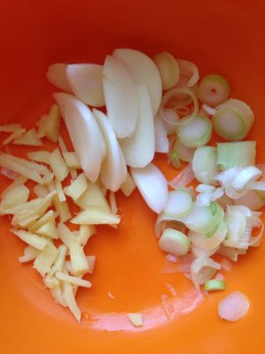 葱姜蒜准备好。这是单位食堂大师傅准备好的,我就省事了。不过这种切法不符合我的要求。凑合用吧。呵呵。