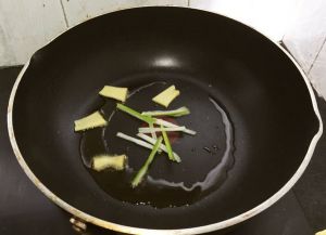 待葱姜爆香至啪啪声后,以滑鱼方式下锅小火慢煎。