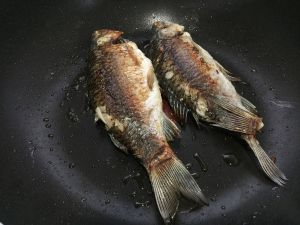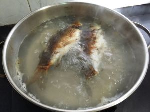 鱼煎至鱼皮微黄后加水熬汤。为控制食用油的摄入量,可在鱼煎好后倒掉多余的油。大火熬开后转小火慢炖。