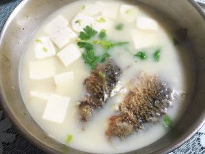 待大火滚至鱼汤完全呈奶白色后,再煮制一段时间,待要出锅前加入豆腐块,小火慢再炖至汤汁浓稠。