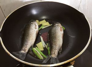 将新鲜鲫鱼清理干净,内脏一定要冲洗干净。姜切片,葱切段