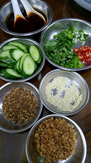 准备调味汁:淋热油爆香配菜(芝麻,蒜末,小米辣,葱末),加入生抽2大勺,陈醋1大勺,蚝油1大勺,香油1勺,糖1勺