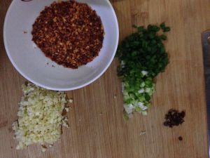 少量油烧热倒在辣椒粉上,再次倒少量油把蒜末和剩余花椒,一定小火炸一下哦!再次倒入辣椒碗里加入两勺生抽、一勺香醋、少许盐、一勺鸡汤。