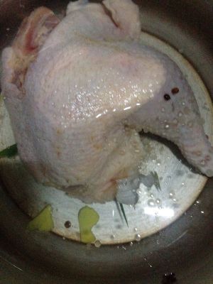 把杀好的活鸡洗干净,用开水过一下装入一边再重新加水放入八角,桂皮,姜片,蒜片,花椒粒二十来颗,用火煮沸,十五分钟左右,看熟没有就用筷子插入最厚的肉里,很轻松就穿过的就行了,然后加适量盐调味,闷十来分钟。鸡汤可以留半碗。把鸡放进事先预备的冷开水里放置。