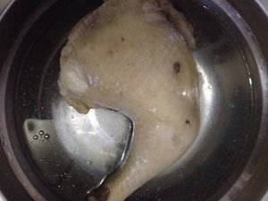 煮好的鸡腿用冰水泡一会,这样鸡肉的皮口感会很好