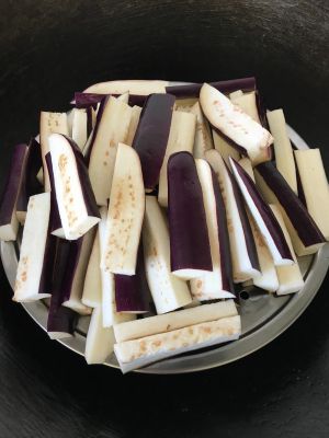 锅内底油是平时炒菜的两倍,加入茄子,小火翻炒