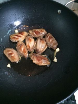 浸泡期间切好蒜头,姜以备用,热锅下油,放入浸泡好的鸡翅煎炸至金黄色即可,加入蒜姜,盐巴煸炒一会,再加可乐未到一半左右,可减少不易多过,如果加多了就加点水,盖锅煮10分钟左右收汁,即可!