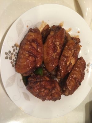 至两面都金黄色后,放入姜和葱白炒热至出味道,加可乐淹没鸡翅,再加入少许糖,醋,老抽 调味与染色。焖至酱汁三分之一后,起锅装盘即可。