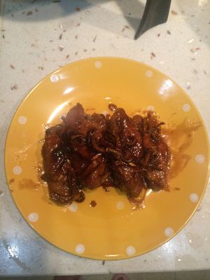 煎好了加一勺料酒 。生抽 。海鲜酱油 。爆一下 。其实加一点老抽也行 。但颜色特别容易深 。所以我没加 。。生抽可乐海鲜酱油的颜色就够了 。。