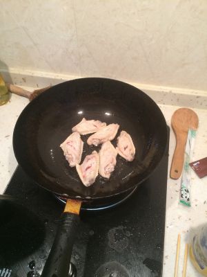 下油锅,不断翻炒,以免糊底,小火将鸡翅根煎至金黄。