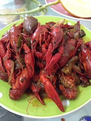锅底留油,放所有香料炒,炒出香味,放火锅底料,放啤酒,放炸好的小龙虾,放盐调味,盖盖子,闷七八分钟
