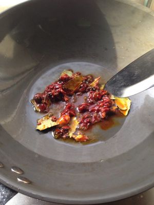 锅里热油 油热开小火炒郫县豆瓣酱 香叶八角 花椒麻椒