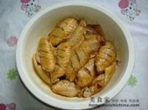 用生抽3茶匙,老抽1茶匙,花椒粉、胡椒粉、盐、鸡精适量腌制鸡翅半小时。