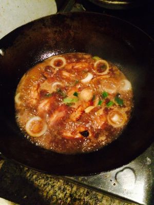 依次倒入老抽,料酒,可乐,少许盐,糖,葱(锅里的洋葱是我昨天炸洋葱圈剩的,不能浪费,扔锅里提味,哈哈)中火收汁