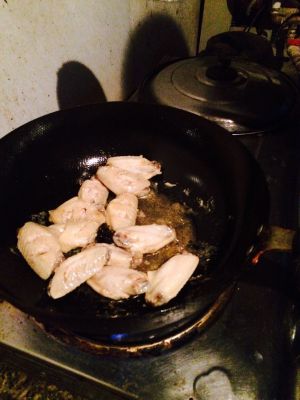 将腌好的鸡翅放入锅中煎至微黄,捞出(光顾着找手机照相了,结果火大了,哈哈)