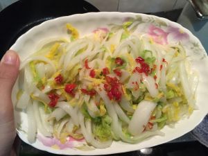 娃娃菜取出放入炒锅内(不必沥干),加入切好的小辣椒一起翻炒