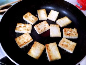 热锅烧油,豆腐切片下锅,煎至两面焦黄