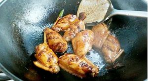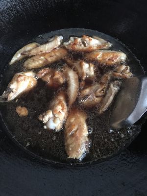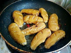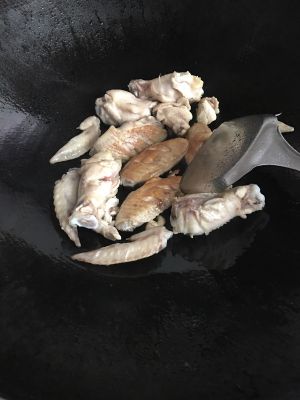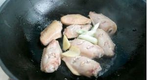 将油锅起火放入姜片爆炒,然后放入腌好的鸡翅和鸡脖,在到入可乐直到收汁,就可以了