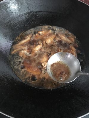 鸡翅煎炸成金黄色后倒进可乐、酱油、盐、白糖