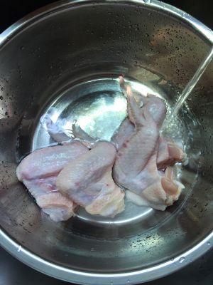 鸡翅洗净,两面横切一两刀,适量盐,两勺生抽,一勺料酒,腌制半日;冷水下鸡翅,中大火五到七分钟,冲冷水洗净。(减肥者可以把翅中边缘的皮切掉)