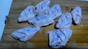 完成啦!(此图为单面竖切,单面横切)鸡翅双面横切腌制更入味,去血水时更容易,也更容易熟。