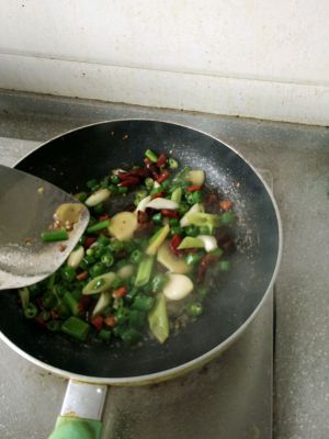 另起油锅,放入花椒、泡椒泡姜,大火爆炒。