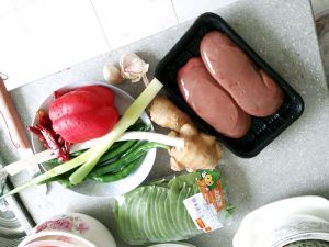 腰子切花,泡去血水。泡椒泡姜少许,青椒切块