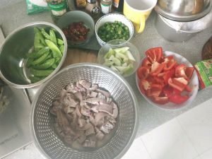 然后切好辅料备用哦,ps:猪腰在沸水里烫5秒捞起来。