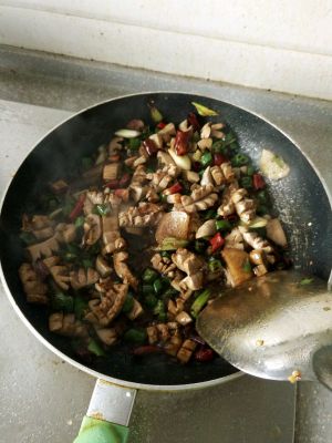 先烧热锅,然后倒油,等油稍微冒烟,下腰花。快速翻炒几下,腰花稍微变色,倒入切好的泡辣椒,泡姜!少许白糖!再继续翻炒,最后加入葱段,出锅!