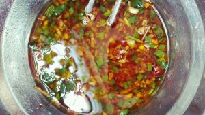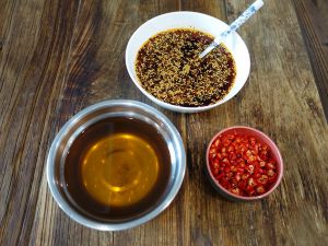 然后准备常规麻辣调料。大蒜和生姜磨成姜蒜泥,适量红油辣椒、花椒油、生抽、白糖、花椒粉、鸡精、盐、凉拌醋(根据口味选用)。所有调料混合拌匀在一个碗里备用。另外再切碎一些新鲜小米辣椒。