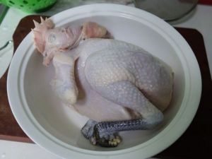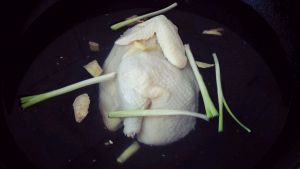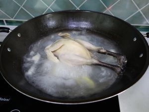 洗干净的鸡放沸水中煮约15分钟,水里可以放几片姜去腥。煮的中途给鸡翻个面,或者干脆让水完全将鸡淹没。
