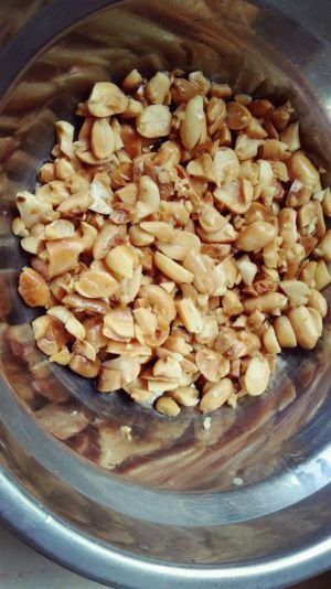 花生米先用水泡十五分钟,按时间统筹,这个应该是第一步,哎哟,我写反了,大家将就看——泡好后皮一撮就掉了,锅中热少量油,转小火,沥干后花生君下去炒熟,乘出然后捣碎,可以等冷却后装进保鲜袋,然后就在菜板上随便碾压~