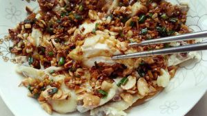 鸡捞出切块码放碟中,倒入酱汁,撒上芝麻和花生碎,