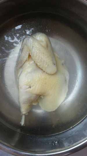 取出煮好的鸡肉君,这个时候它还是那样优雅,就是大腿被我戳了个洞( •̀∀•́ )马上放入我们之前就准备好的冰水里,看它好高傲的样子~放凉取出来,这个时候需要一把锋利的刀,能切得整齐一点^
