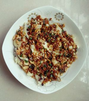 上一句是给你们说的,我的刀功实在是呵呵哒,总之切好后放盘子里,均匀浇上我们之前准备的调料,撒上花生碎,滴几滴香油假装我们点缀了一下,就OK.了!