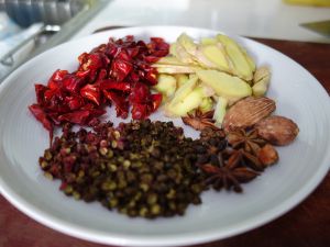接着开始家庭秘制麻辣香油的制作。切一些姜片,剪一点干辣椒,抓一把花椒和藤椒,再来几颗八角和草果。备注:藤椒就是青花椒,也可单纯只用花椒。